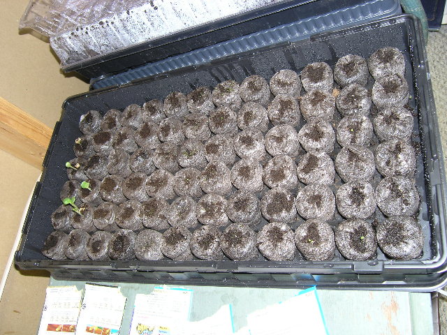 Okay, let me be honest. For one thing, I suspect I rather overwatered the peat pills. I'm guessing I put somewhere in the neighborhood of three-quarters of a gallon of water in each 72-pellet starter bed, for one thing. For another, I did a standard mix of Miracle-Gro in the first quart of water in each starter bed. As much as anything, it was to allow for the neglect I sometimes visit on started sprouts, since I know I kill houseplants by overwatering most of the time (cf the amaryllis upstairs on the mantel in the living room, which has more brown than green on it, by now).